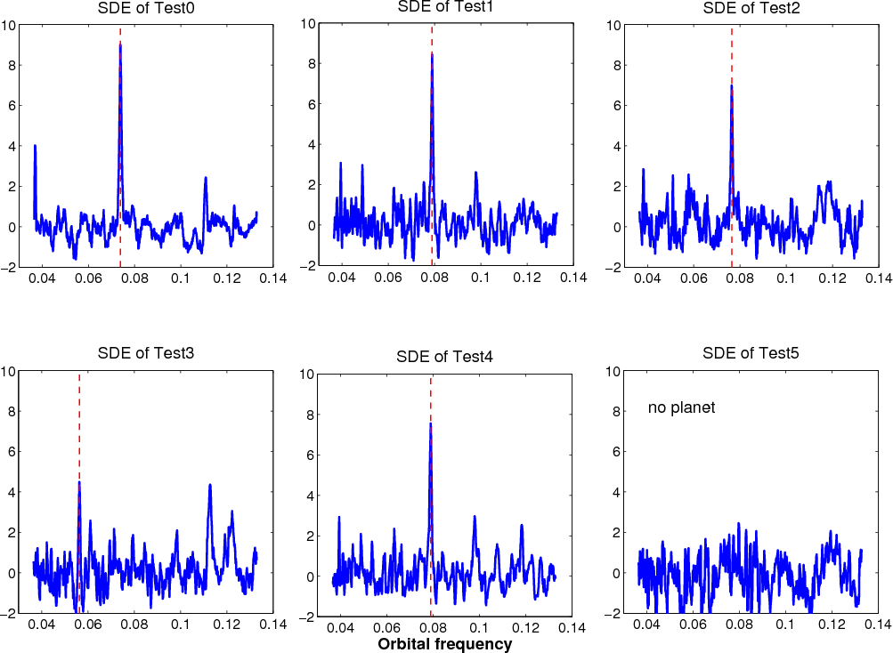 The six tests signals were such that Test0 was relatively easy and not blind (it was used primarily to make sure the test procedures are working) - but still the simulated system was a physically-possible system, while Tests 1-5 were completely blind. Figure 3 shows the resultant CB-BLS periodograms and Table 2 gives the resultant best CB-BLS fits values. All six test LCs were correctly identified, where notably Test5 was correctly identified only when the single-depth SR of Sect. 2.1 was used. Note that the simulated planets had their the inclination and position angle varied to some extent and that their LCs also account for limb darkening - but since these none of these features are derivable from CB-BLS they are not given in this comparison.