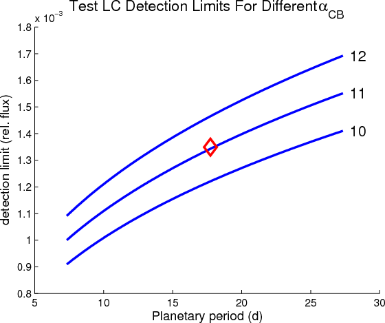 We note that the derived detection limit is for the best-detectable configuraton of planetary orbits, which are those that are coplanar with the line of sight and at the same position angle as the EB's orbit. Finally, we remark that relaxing the Gaussian noise requirement may be achieved by quatifiying the correlated noise (e.g. as