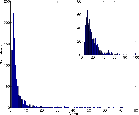 Figure 6: Histogram of the Alarm statistic for 1000 objects (all objects in some magnitude range) of the TrES Lyr1 dataset. The insert shows the lower part of the Alarm distribution before the first iteration for variable-stars filtering (see text). After we used only stars with Alarm <35 to calculate one SYSREM effect - the Alarm distribution of the same objects looked as shown on the main panel. |