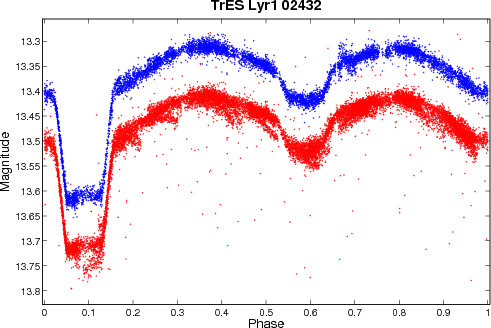 Figure 7: Two light curves of star 02432 from the TrES Lyr1 field. Bottom, Red LC: the light curve as posted on the public NStED database: it was detrended with no special care for intrinsic variability. Top, Blue LC: the same raw data processed as described in the text - with cleaning procedures applied only to the residuals. Note that transit detection in LCs such as the red LC is nearly impossible. |