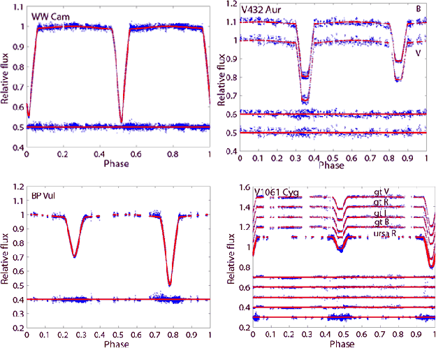 Figure 10: Some of the open literature EBs to which the CB-BLS analysis was applied. Each EB light curve is phased to it's orbital period with the best-fit model over plotted and the model residuals drawn below. |