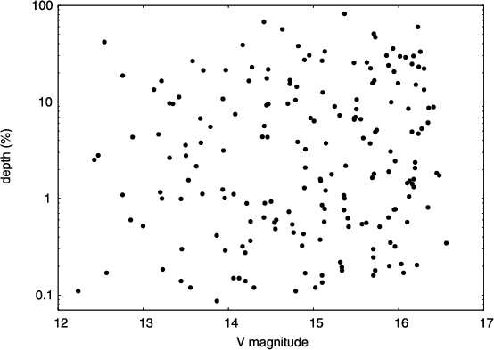 Figure 7: Transit depth versus V magnitude for all sources with detected transits (planetary candidates and clear stellar binaries). |