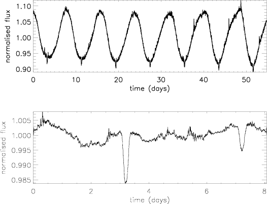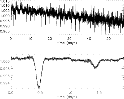 Figure 2: An eclipsing binary found in IRa01 showing in phase modulation. Raw ( top), smoothed, and detrended folded light curve ( bottom). |