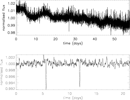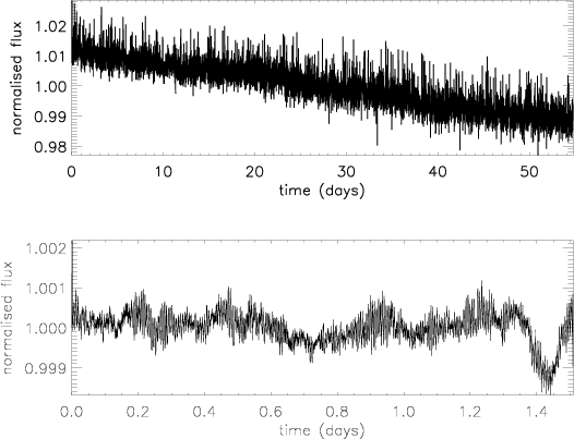 A study of the noise properties was performed by Aigrain et al. (2009). They claim that, after pre-processing of the light curves to minimize long-term variations and outliers, the behaviour of the noise on a 2h timescale is close to pre-launch specification. However, a noise level of a factor 2-3 above the photon noise is still found because of the residual jitter noise and hot pixel events. Furthermore, there is evidence of a slight degradation in the performance over time for the first 3 long runs (IRa01, LRc01, and LRa01).