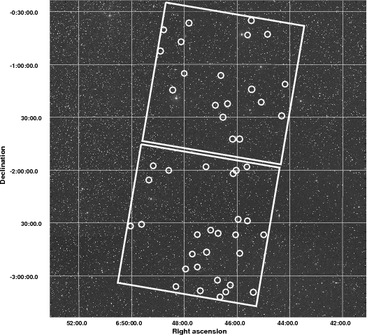 Figure 5: DSS image of the sky observed by CoRoT during the IRa01. Overlaid are the positions of the 50 planetary transit candidates and the portion of the field covered by the 2 exoplanets CCD. |