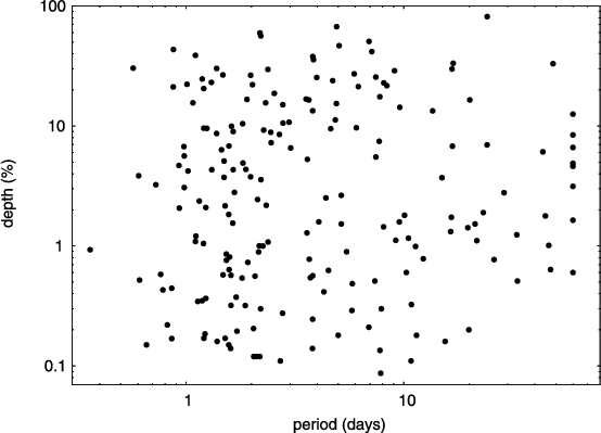 Figure 6: Transit depth versus orbital period for all sources with detected transits (planetary candidates and clear stellar binaries). |