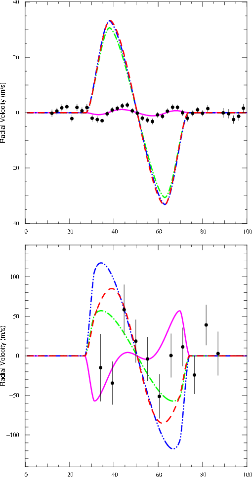 Top: For HD 189733: dash (red) is the simulated spectroscopic data with