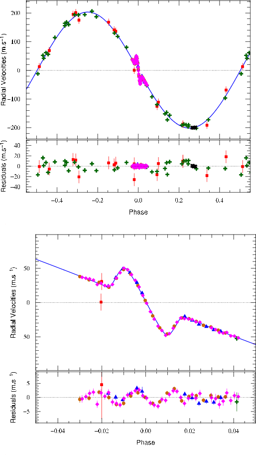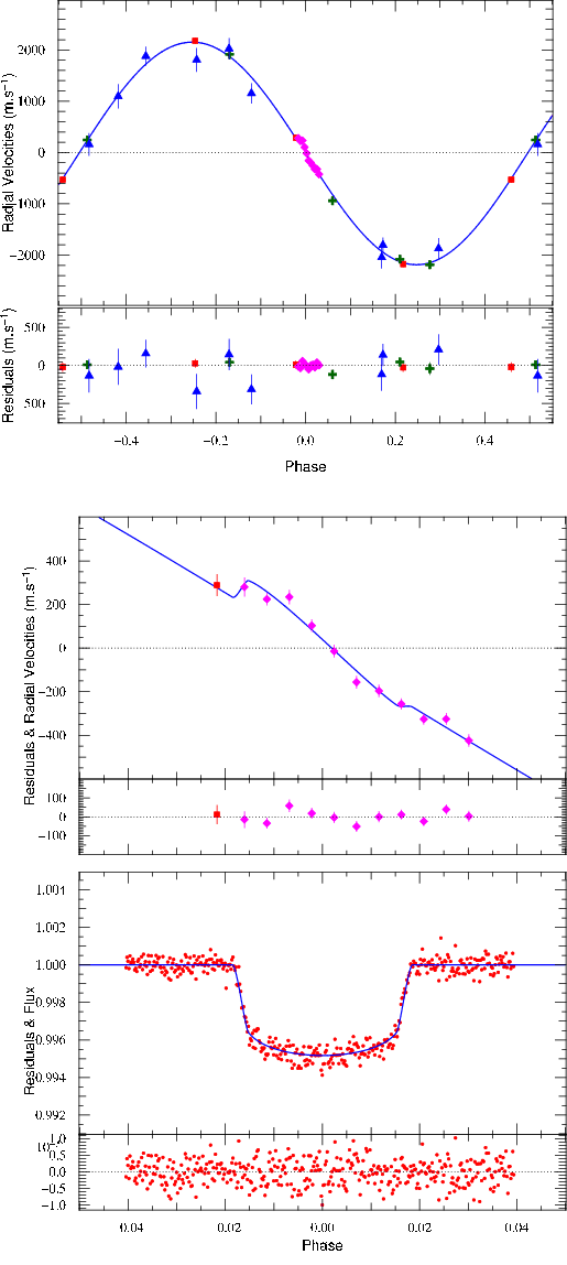 Figure 1: Top: overall Keplerian fit of the RV data for CoRoT-3b. Bottom: composite plot showing both the spectroscopic and the photometric transit for CoRoT-3b. (red) squares are Harps measurement which are not part of the RM sequence, (green) crosses are Sophie measurements, (blue) triangles show TLS data and (magenta) diamonds indicate the RM Harps sequence; (red) circles are for the CoRoT photometry. |