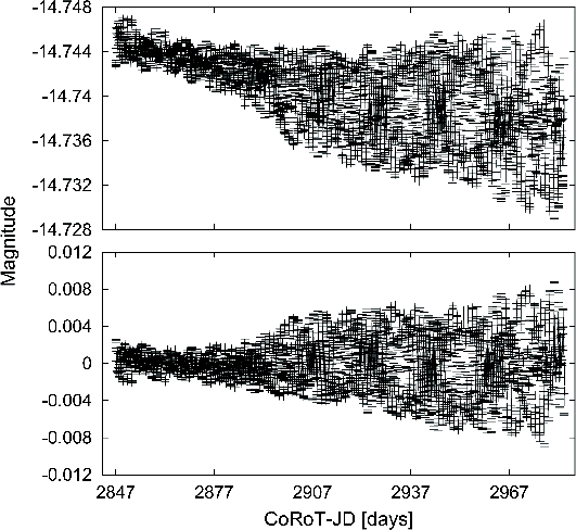 Figure 1: Top: CoRoT light curve of the star HD 50 209. Bottom: CoRoT light curve detrended with a polynomial of second degree. |