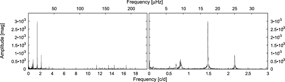 Figure 2: Left: complete Fourier spectrum for HD 50 209 showing aliasing effects at the orbital frequency 13.97 cd-1. Right: Fourier spectrum for HD 50 209 in the domain of the detected stellar frequencies. |