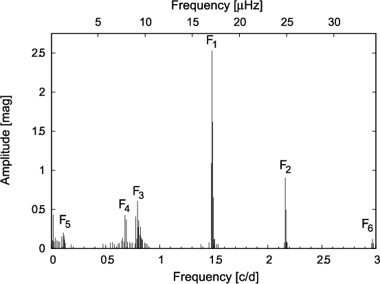 The entire set of detected frequencies together with their amplitudes is plotted in Fig. 3. The frequencies found are distributed in 6 main groups (Fi with i=1,...,6). The frequencies with the highest amplitudes are listed in Table 1. All groups are clearly separated, except those centered on f3 and f4. In each group we note the existence of equidistant multiplets separated by intervals marginally larger than our frequency resolution. In Fig. 4 we provide the diagrams of the folded light curve with the two main frequencies f1 and f2.