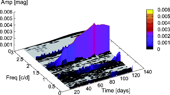 Figure 5: 3-D view of the frequencies determined using the time-frequency analysis with a sliding window of 30 days. The color scale indicates the amplitude of the detected frequencies in HD 50 209. The time origin corresponds to HJD = 2 454 391.95. |