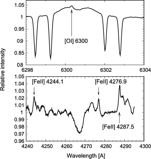 Figure 6: Top: forbidden emission line of [O I] at 6300 Å. Bottom: three forbidden emission lines of [Fe II] at 4244.1 Å (21F), 4276.9 Å (21F) and 4287.5 Å (7F) from the spectra of HD 50 209. |