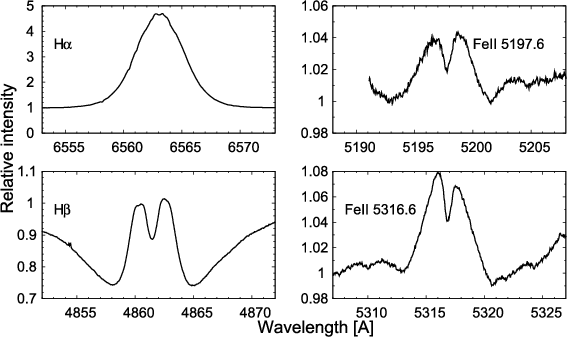 In addition, forbidden single-peaked [O I] 6300 Å and [Fe II] emission lines are detected with a very weak intensity (
