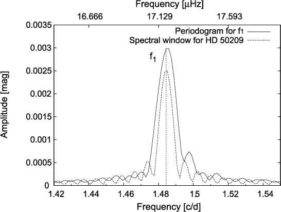 Figure 8: Periodogram of the original light curve (solid line) and spectral window shifted at f1=1.48444 cd-1 (dashed line). Note that the full width at half maximum of the peak in the periodogram at the frequency f1 is broader than expected from the spectral window, suggesting the presence of more frequencies or amplitude changes. The vertical line indicates the position of the frequency f1. |
