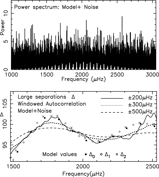 The principal goal of this paper was to show that narrow frequency windowed autocorrelation can, in principle, reveal information on the variation of the large separation with frequency and therefore constitutes a tool that might be useful in obtaining some information about a star even when individual frequencies cannot be extracted, or modes cannot be identified. Much remains to be done to refine the technique: the theoretical analysis needs to be further developed and the nature of the interaction of noise with the autocorrelation power better understood.