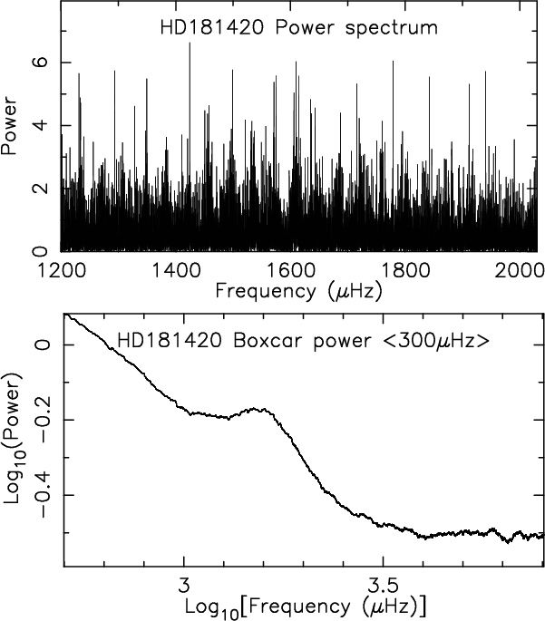 HD 181420 is an F2 (mv=6.57) star observed by CoRoT in a 156 day run (Michel et al. 2008, Barban et al. 2009). Details of the data reduction are given in Barban et al. (2009), but are essentially the same as described above for HD 49933. The power spectrum is given in Fig. 12a and a boxcar spectrum in Fig. 12b. There is excess power in the p-mode frequency range