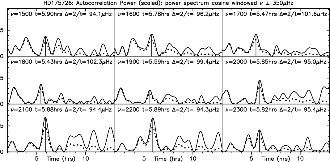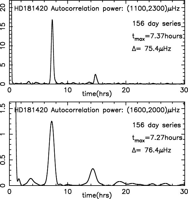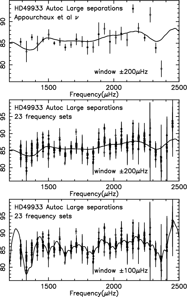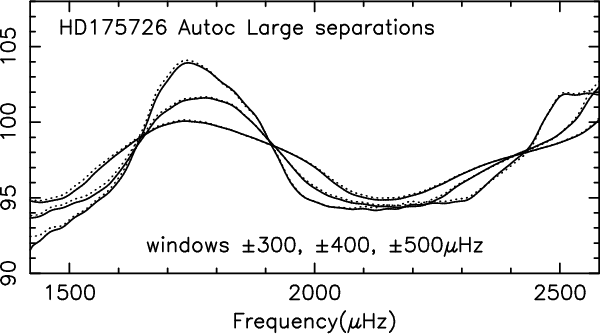 Hz. It is therefore worthwhile to look for evidence of variations of the large separations with frequency using narrow-windowed autocorrelations - indeed it was the challenge presented by this star that initiated the research reported here.