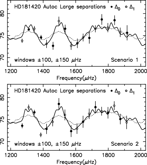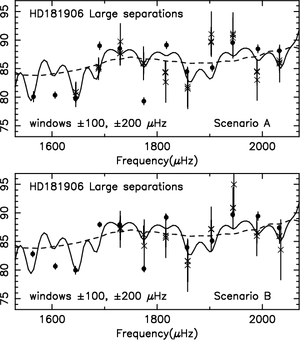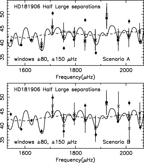 from the peaks in the autocorrelation power; the results are in Fig. 17a for García's Scenario A and Fig. 17b for Scenario B. The circles in these diagrams are the values obtained with García's frequencies and the crosses those from 3 different analyses by Verner, each with their estimated formal errors. The considerable difference between values from different frequency extraction algorithms illustrates the difficulty in deriving reliable values of the frequencies for this star Figs. 18 gives the values of the half large separations using an