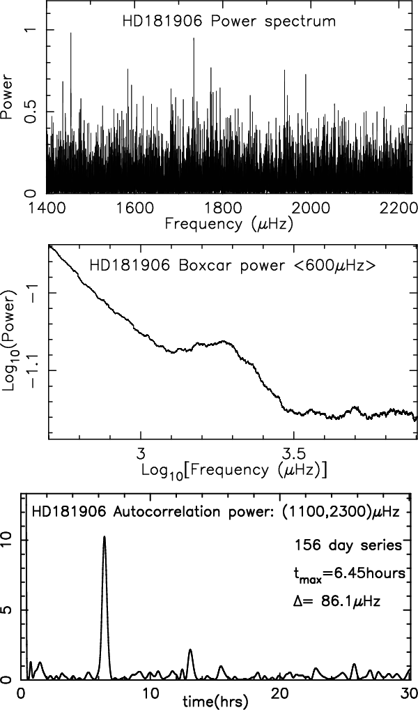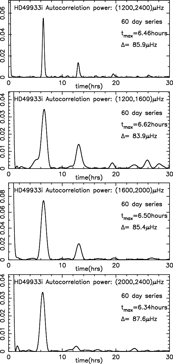 Hz. The power spectrum was derived from the time series by the same procedures as for HD 49933. Figure 16c gives the autocorrelation power for a wide frequency window of