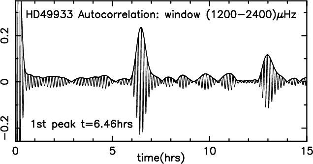 One can see immediately that peaks are expected in the autocorrelation function of a photometric time series due to p-mode oscillations. Such oscillations are acoustic waves excited by surface convection. A wave packet produced near the surface of the star propagates to the far side of the star in time 2T, where T is the acoustic radius of the star, and is reflected back arriving at (or near) the point of emission at 4T. Thus one expects a peak in the autocorrelation at
