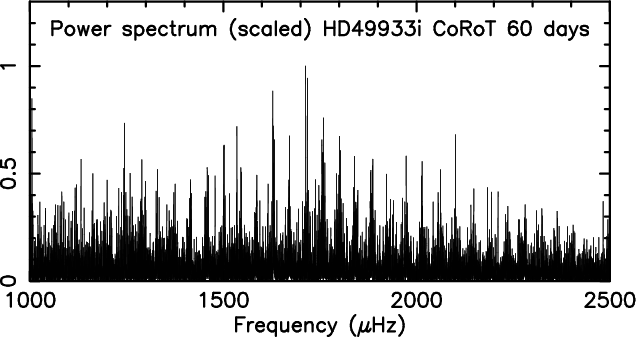 Hz. Details of the extraction of frequencies are given in Barban et al. (2009) but as with HD 49933 it is difficult to discriminate between peaks corresponding to modes