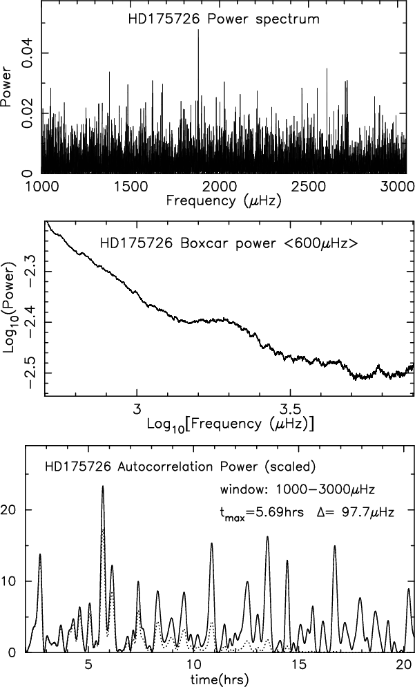 HD 175726 is a F9/G0 (mv=6.72) star observed for 27 days in the first short run of CoRoT. Details of the properties of this star are given in Mosser et al. (2009). As for HD 49933, the level 2 CoRoT time series has a 32 s cadence, and (9 min) gaps due to passage through the South Atlantic anomaly filled by linear interpolation. The major variations in the light curve were removed by subtracting off a running mean, and experiments using different running means and different gap-filling procedures showed that the results described below were largely independent of these procedures. The power spectrum is shown in Fig. 5a, individual p-modes cannot be seen in the spectrum, but in the boxcar spectrum shown in Fig. 5b a slight excess of power can be seen in the p-mode frequency range