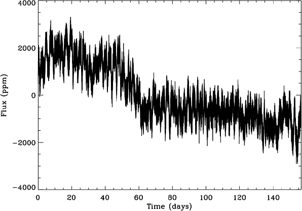 We collected 156.6 days of continuous data - from 2007 May 11 until 2007 October 15 - with an overall duty cycle of 89.3%. Most of the gaps (each of a few minutes duration) are due from data loss during the crossings of the South Atlantic Anomaly (see for a detailed explanation: Auvergne et al. 2009). These gaps were linearly interpolated in the lightcurve to avoid putting zeros. We verified that this interpolation does not introduce any spurious frequencies into the Fourier domain. The original 1-s cadence raw data were corrected and calibrated into level-2 (or N2) data following the methods described in Samadi et al. (2006). The N2 lightcurve is sampled on a regular grid in the heliocentric frame with a cadence of 32 s. Then we removed a low-frequency trend due to the aging of the CCD (Auvergne et al. 2009), and finally we removed some outlier points (0.013%). The resulting lightcurve shows a small modulation during the first 60 days (see Fig. 1) and then a very flat behavior. At this point, it is impossible to disentangle a real modulation of the star from an instrumental effect. A second modulation - around 3 days - is also visible and could be related to the surface rotation due to the signature of magnetic activity on the surface of the star.