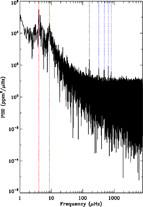Figure 2: Power spectrum density of the full 156-day N2-lightcurve shown in Fig. 1. The two red-dotted vertical lines show the lowest significant peak and the first harmonic that could be the signature of the surface rotation of the star. The five blue-dotted vertical lines indicate the first harmonics of the orbital period of the satellite. |