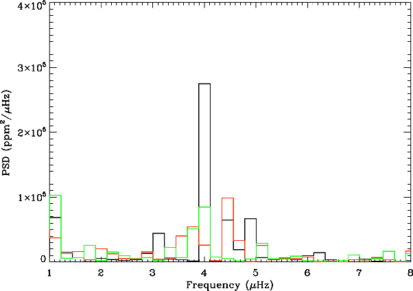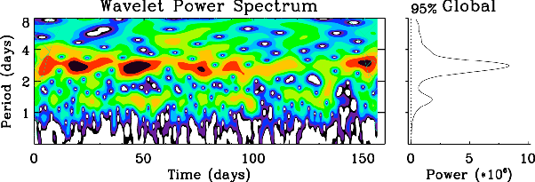 With the global wavelet power spectrum defined as the horizontal average of the time-period diagram (see Fig. 3 (right)), we observe that most of the power - more than 99% - is concentrated in this main periodicity at 2.81 days. A smaller peak is also visible at 1.41 days but containing much less power. This method (successfully tested with numerical simulations and with solar data from the GOLF instrument, Mathur et al. 2008) allows us to disentangle between the peak corresponding to the main periodicity and that of the harmonic by the simple visual inspection of the PSD where 2 peaks of similar characteristics stand at 4.04 and 8.2 Hz.