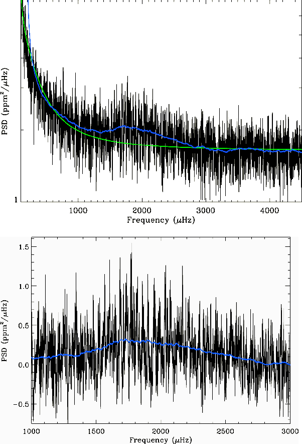modes will appear ``spikier'' than they really are (we lose the Lorentzian tails in the background noise), meaning we will be biased to fitting small line widths. We expect that the autocorrelation of the power spectrum will have better SNR than seen in individual modes, hence we look there for the features associated with mode line width. The features in it are quite wide, implying that the line widths are large and probably in line with what we saw for HD 49933 (see Fig. 12). Indeed, the widths of the modes in both stars, around the maximum of the p-mode spectrum, seem to be similar, which favors shorter mode lifetimes than in the Sun.