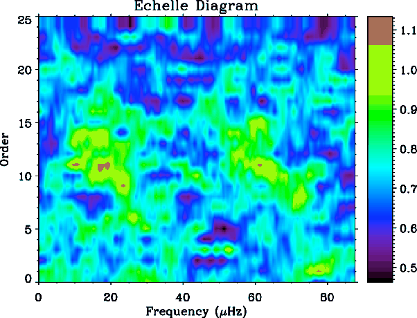 Another parameter - the global line width - was found to be rather small (1.25 -0.3/+0.4 and 1.28 -04/+0.6 Hz for scenarios A and B, respectively), which is probably a consequence of the low SNR that could bias this estimate when we apply our peak-bagging codes: the low SNR means the
