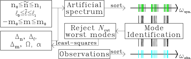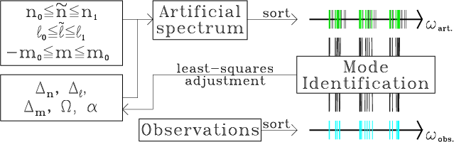 - this match between the artificial and observed frequencies yields a mode identification. Based on this mode identification, the formula coefficients are then recalculated through a least-squares minimisation of the standard deviation between the artificial frequencies and the observed ones.