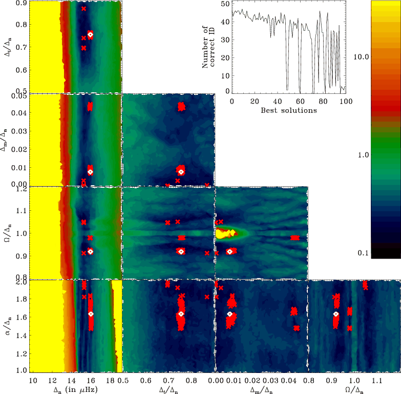 Superimposed on these plots are the positions of the 100 best solutions, as represented by the red crosses. As can be expected, these crosses are concentrated in the dark regions which correspond to the best fits. The white diamonds show the exact solution. The plot in the upper right corner, besides the colour bar, indicates the number of modes correctly identified. As can be seen from these plots, the correct solution has a basin around it which attracts most of the 100 best-fitting solutions. Some other secondary basins around other solutions also appear and attract a few of the best-fitting solutions.