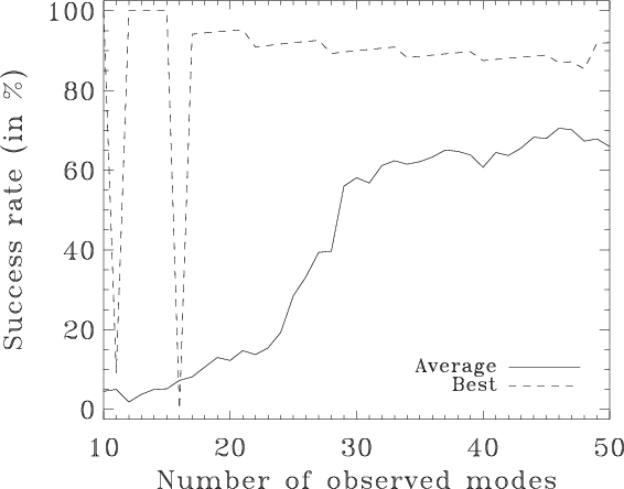 Another interesting test consists in changing the number of observed modes. This has been done for case 4 of Table 1. Two different measurements of the success rate are shown in Fig. 3. The solid line shows the average success rate of the 100 best-fitting solutions whereas the dotted line shows that of the best solution. As the number of observed frequencies decreases, many additional local minima appear in parameter space due to the lower number of constraints. These cause the average success rate to decrease, especially when there are fewer than 30 modes, by attracting an increasing number of the 100 best-fitting solutions away from the true solution. The dotted line, on the other hand, shows that in most cases, the best-fitting solution still remains the true solution. However, in some cases, one or several other local minima with completely different mode identifications produce solutions which fit the observations even better than the true solution, thereby causing a dramatic drop in the accuracy of the best solution. This is illustrated for 11 and 16 observed modes in Fig. 3. As a result, the best-fitting solution must be used with caution.