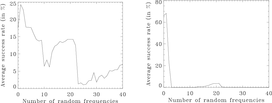 Figure 4: Average success rate as a function of the number of additional random frequencies. The left plot corresponds to low order modes (case 2 of Table 1) and the right plot to high orders (case 4). |