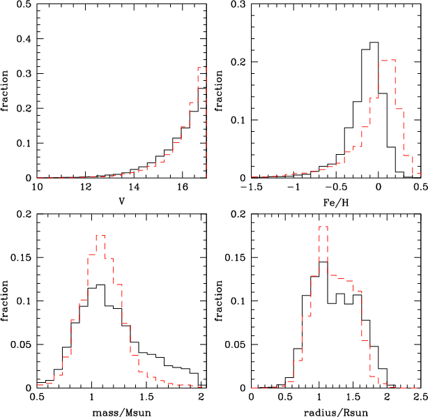 Figure 1: Characteristics of the stars in the IRa01 and LRc01 fields (solid and dashed curves respectively). The V magnitude, mass, metallicity and radius of the stars are derived from the galactic model. Only main sequence stars with V magnitude below 17 and mass between 0.1 and 2.0 solar masses are considered when computing the histograms. The total numbers of such stars, as derived from the galactic model, are 14 011 and 28 302 respectively in the IRa01 and LRc01 fields. |