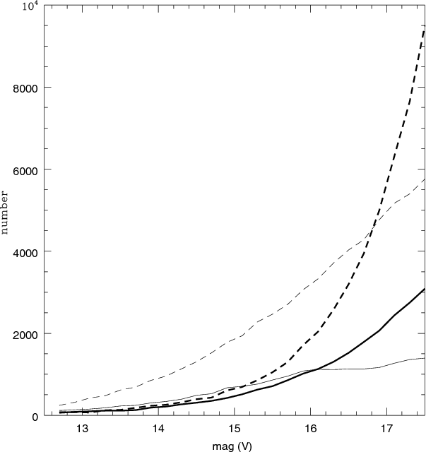 Figure 2: Fraction of dwarf stars, giant and sub-giant stars as a function of the V magnitude for IRa01 and LRc01. The thick curves give the number of dwarf stars per 0.2 V mag bin, whereas the thin curves give the number of giant and sub-giant stars per 0.2 V mag bin. The solid lines are for IRa01, and the dashed lines for LRc01. The cross-over is at lower magnitude for IRa01, compared to LRc01. This can be understood since, for a given magnitude, giants are located farther than dwarfs. In the case of IRa01, there are less giants due to the decrease of disk density with distance, so dwarf stars overcome giants for a lower magnitude. |