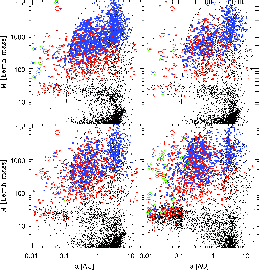 The synthetic transiting planets (green circle) and real observations occupy a similar area of the mass versus semi-major axis diagram, with however some differences. In particular, some synthetic planets are found at masses slightly lower than the actual detected planets, and some of them are found very close to their central star. However, note that, as mentioned at the beginning of this paper, the computational disk in our planet formation model extends down to 0.1 AU. At the time the inner boundary of a forming planet feeding zone enters the innermost 0.1 AU of the disk, the formation process