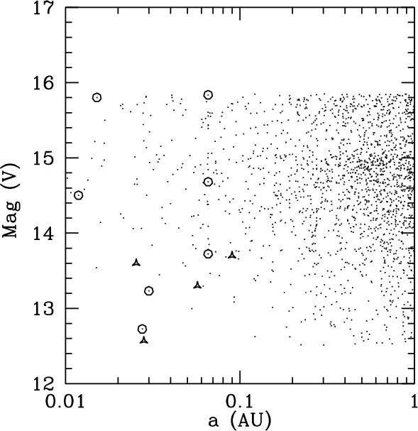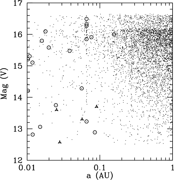 Figure 4: Semi-major axis versus V magnitude for models and observations. Small dots are results of models, circles are synthetic transits, and triangles are real observations. The theoretical model is the nominal one, the target selection is assumed to be ``ideal''. |