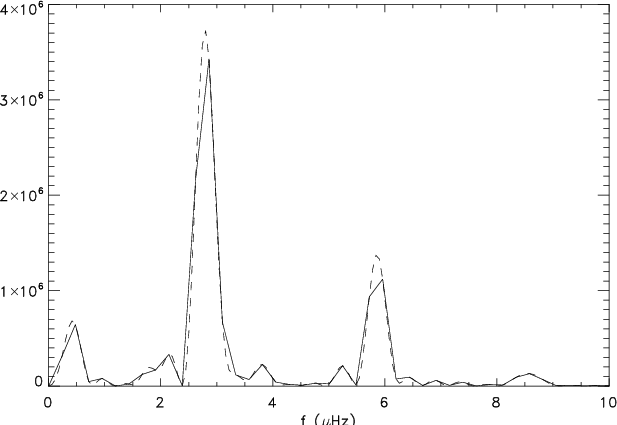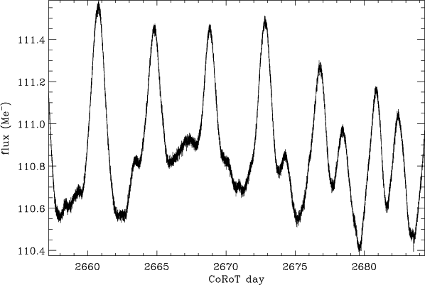 The time series shown in Fig. 1 exhibits a strong periodic modulation, with a period of about 4 days and a peak to peak amplitude of about 1%. A detailed analysis of this time series is given by Mosser et al. (2009). In the Fourier spectrum, this modulation results in a strong peak at about 2.8 Hz, and corresponds to a rotation period of about 4.0 days. (Fig. 5). According to this measurement and to the