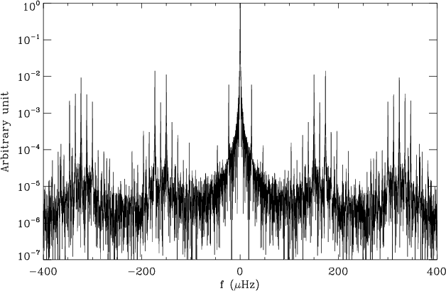 The low-frequency interpolation does not correct the power residuals at the high harmonics of the orbital frequency. These harmonics, due to the window and the high-frequency signal where the seismic signature is searched for, still dominate the spectrum up to 2 mHz. Therefore, we had to correct the power observed around the harmonics of the satellite rotation, by replacing the spurious peaks by the local mean power observed in the spectrum.