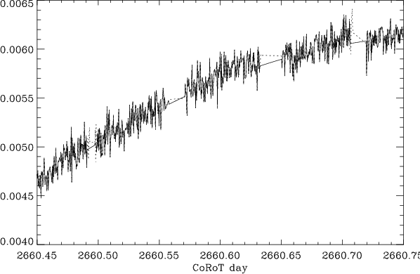 Due to the large low-frequency variations in the time series possibly combined with the incomplete window, we have to take care of the quality of the interpolation used for replacing the missing or possibly corrupted data, in order to avoid power leaking to high frequency. Therefore, we have replaced the contaminated data by values derived from the low-frequency interpolation of the time series based on the algorithm proposed by Holdschneider et al. (1989) (Fig. 3). This treatment proved to be efficient, as shown in Fig. 4, where we verify that the power at medium frequency, where granulation is suspected, cannot be due to the power leaking from the low frequency peaks.