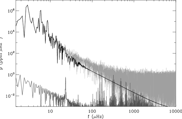 Figure 4: Power density spectra of the corrected time series (light grey line), of the low-frequency interpolation (black line) and, with an adapted scale, of the window (dark grey line). Note the axes use logarithmic scale. |