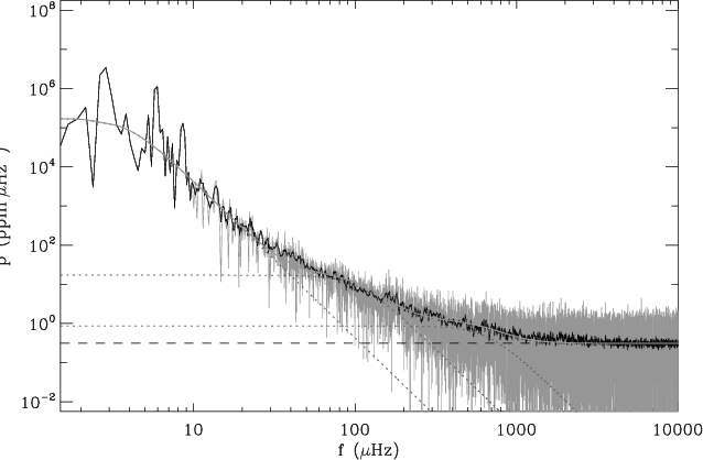 Following Michel et al. (2009), we propose a fit for the stellar background component in the low-frequency pattern, with three Lorentzian-like components in the low-frequency range (below 1 mHz):
