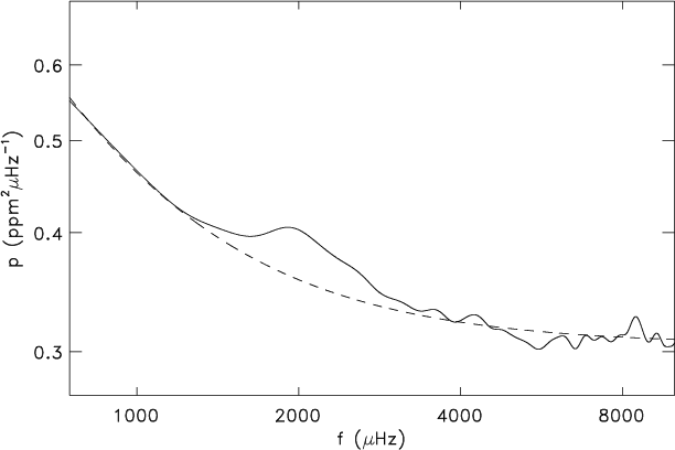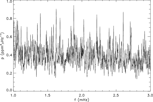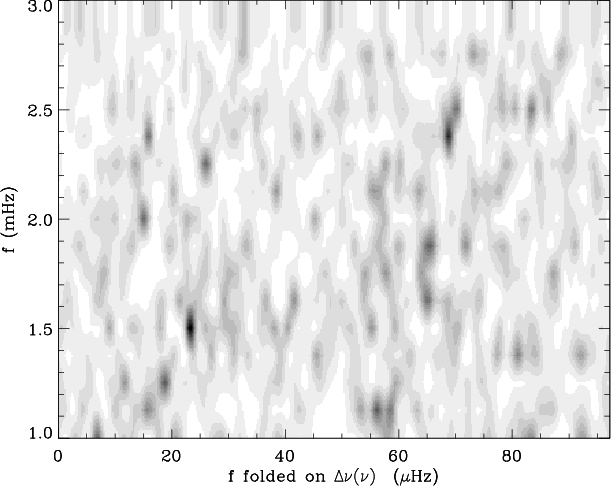 Hz), but is fully compatible with the value already noticed for the frequency of maximum power. We consider that the unambiguous excess power at 2 mHz (Fig. 7) reinforces the identification of the large separation.