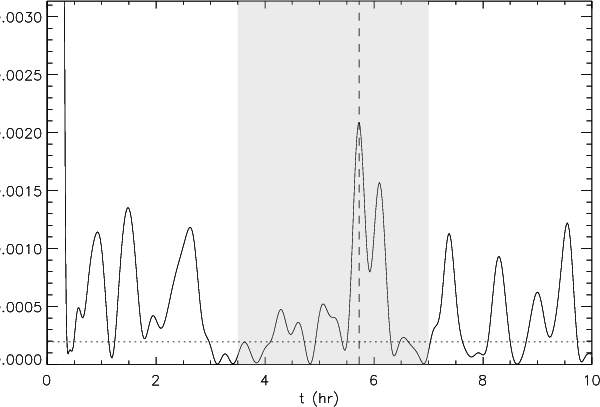 With such a low signal-to-noise ratio, estimating lifetimes in the spectrum is at least as difficult as estimating eigenfrequencies. A clue indicating that the lifetimes are short is given by the use of the H0 hypothesis (Appourchaux 2004). Appourchaux addresses the case of the H0 test with binned data, in order to enhance the detection of modes with finite lifetime. Most of the peaks revealed by the analysis above remain undetectable with the test applied to unbinned data, but can be found when considering large bins. The maximum number of peaks exceeding the limit defined by the H0 test occurs as soon as 9 bins ares considered, which corresponds to 3.8 Hz. Accordingly, the mean mode lifetime is then estimated to be about 3 days.