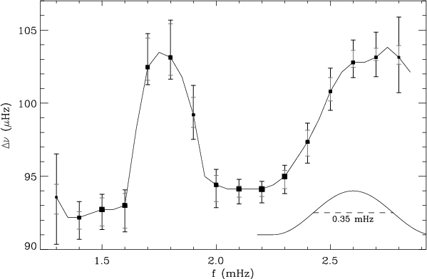 Figure 10: Variation of the large separation with frequency, derived from the autocorrelation. The power spectrum was first windowed with a 0.35 mHz-half width cosine filter, as indicated in the lower-right corner. The sampling of the curve corresponds crudely to the mean large separation. The size of the dots is representative of the amplitude of the correlated signal. Error bars derived from simulations are overplotted: total error is given in black, whereas the grey bar corresponds to the contribution of the internal error. |