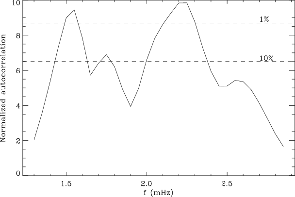Open with DEXTER - the third term contributing to the error bar is related to the interference between noise and signal. The noise complicates significantly the autocorrelation function as shown by Fig. 10, and compared to solar results obtained by Roxburgh & Vorontsov (2006). At low seismic amplitude, this term represents of course the main source of error. At maximum signal, around 2 mHz, the autocorrelation peaks have a signal-to-noise ratio of about 10.