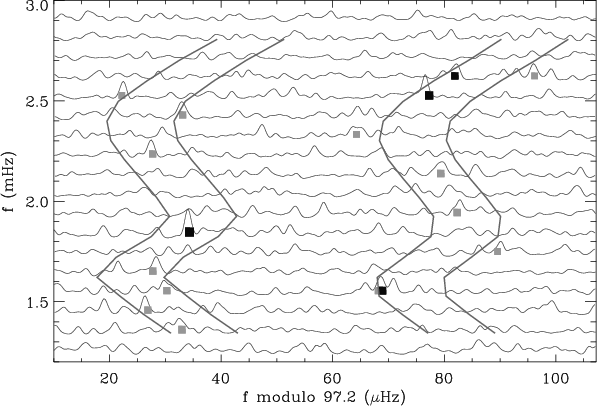 Figure 12: Échelle diagram of the smoothed spectrum, with indication of the possible ridges identified according to the varying large separations shown in Fig. 10. The grey squares indicate the location of the peaks with a height-to-background ratio greater than 3; the black squares indicate the location of the most confident peaks (above 95%) identified by the H0 test. |